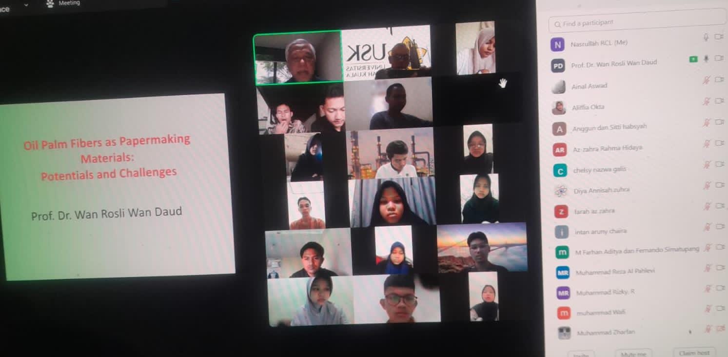 Dalam presentasinya, Prof. Dr. Wan Rosli menjelaskan bahwa limbah kelapa sawit memiliki potensi besar untuk dikembangkan menjadi bahan baku pulp dan kertas. Berbagai penelitian telah menunjukkan karakteristik kimiawi serat sawit yang mendukung peluang ini. Ia juga mengapresiasi antusiasme mahasiswa yang telah mengikuti kuliah tamu pada dua sesi.