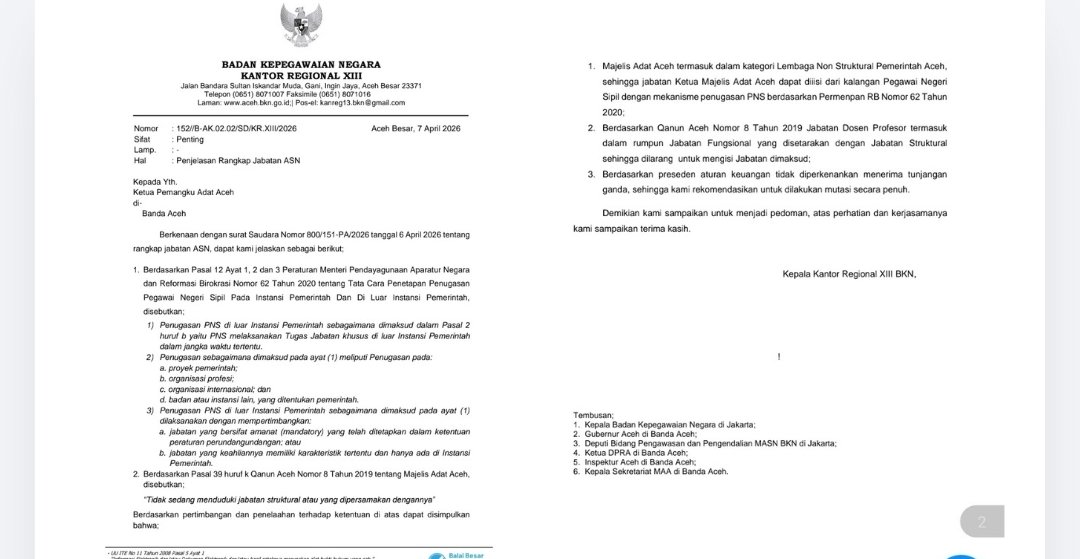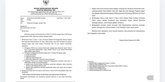 BANDA ACEH – Penanews.co.id – Berdasarkan surat Badan Kepegawaian Negara Kantor Regional XIII nomor 152/B.AK.02.02/SD/KR.XIII/2026 tanggal 07 April 2026 perihal Penjelasan Rangkap Jabatan ASN, jabatan Profesor dilarang menduduki jabatan sebagai Ketua Majelis Adat Aceh.