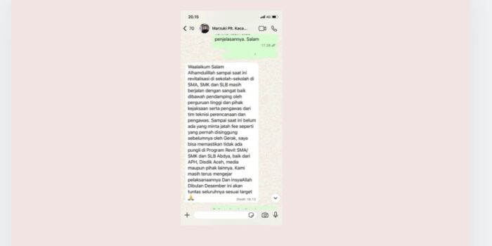 Berikut chat WA Plt. Kacabdisdik Abdya, Marzuki yang di sampaikan kepada kepada WA reporter penanews.co.id