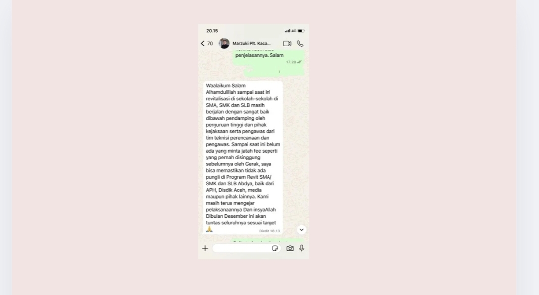 Berikut chat WA Plt. Kacabdisdik Abdya, Marzuki yang di sampaikan kepada kepada WA reporter penanews.co.id