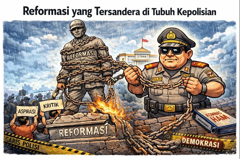 REFORMASI 1998 lahir bukan semata sebagai koreksi rezim, melainkan sebagai ikrar kebangsaan untuk memulihkan kedaulatan rakyat. Dalam imajinasi kolektif bangsa, reformasi menandai tekad untuk membangun negara hukum yang beradab, menundukkan kekuasaan pada konstitusi, serta menempatkan aparat keamanan sebagai pelayan publik, bukan alat politik. Namun dua setengah dekade kemudian, pertanyaan mendasarnya justru semakin mengusik: apakah reformasi benar-benar hidup, atau perlahan disandera dari dalam institusi negara itu sendiri?