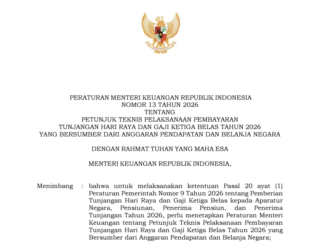 Peraturan Pemerintah Nomor 9 Tahun 2026 tentang Pemberian Tunjangan Hari Raya dan Gaji Ketiga Belas kepada Aparatur Negara, Pensiunan, Penerima Pensiun, dan Penerima Tunjangan Tahun 2026, perlu menetapkan Peraturan Menteri Keuangan tentang Petunjuk Teknis Pelaksanaan Pembayaran Tunjangan Hari Raya dan Gaji Ketiga Belas Tahun 2026 yang Bersumber dari Anggaran Pendapatan dan Belanja Negara,” bunyi pertimbangan PMK 13/2026, yang diterbitkan Menkeu Purbaya Rabu (4/3/2026).