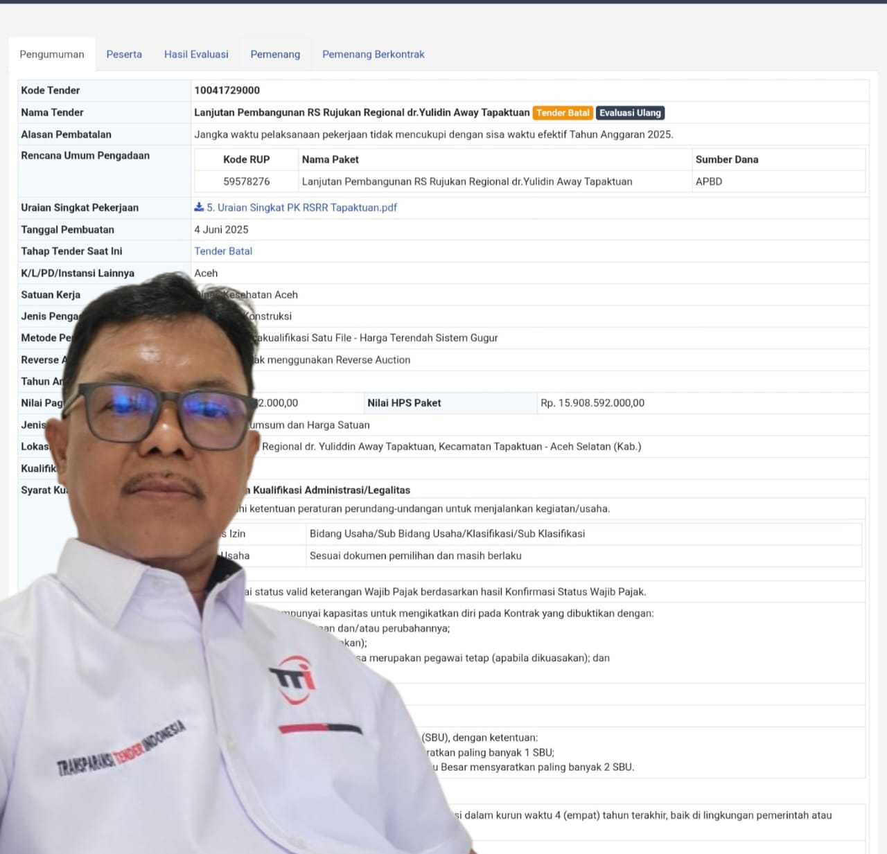 BANDA ACEH – Penanews.co.id — Transparansi Tender Indonesia (TTI) melayangkan protes keras terhadap Pemerintah Aceh usai pembatalan tender pembangunan Rumah Sakit Regional Yulidin Away (RSUD YA) Tapaktuan, Aceh Selatan, senilai Rp15,9 miliar.