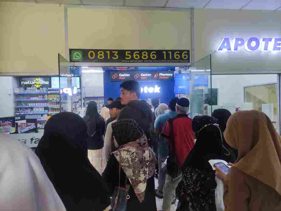 Sesampainya di Apotek Kimia Farma Pasien harus antri lagi, Penanews.co.id, ada lebih kurang 35 orang yang antri dalam dua barisan, satu selesai dilayani antrin dibelakang bertambah lagi dan lagi.