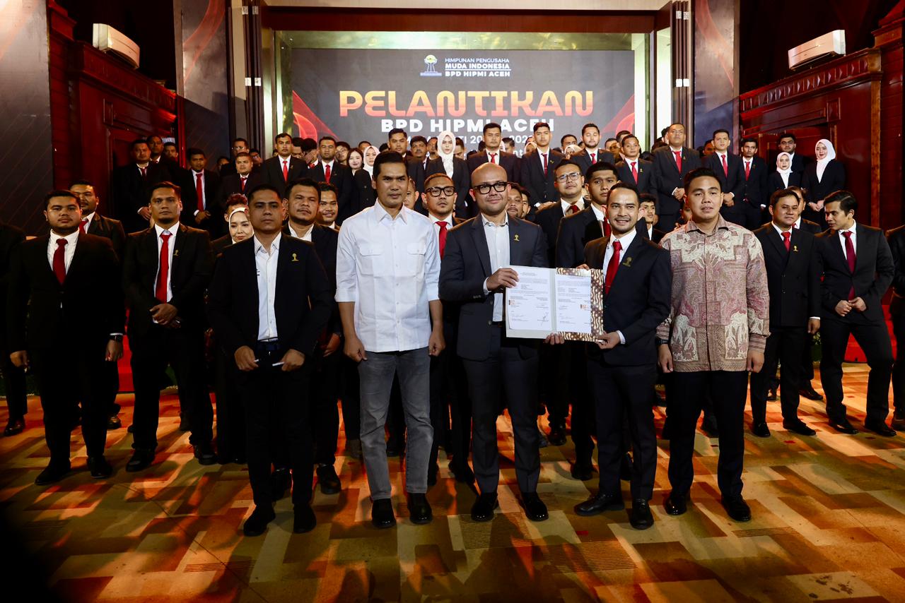Hal tersebut disampaikan oleh Sekretaris Daerah Aceh M Nasir, saat membacakan sambutan Gubernur Aceh pada pelantikan pengurus Himpunan Pengusaha Muda Indonesia (Hipmi) Aceh periode 2025-2028, di Anjong Mon Mata komplek Meuligoe Gubernur Aceh, Ahad (02/11/2025) malam.