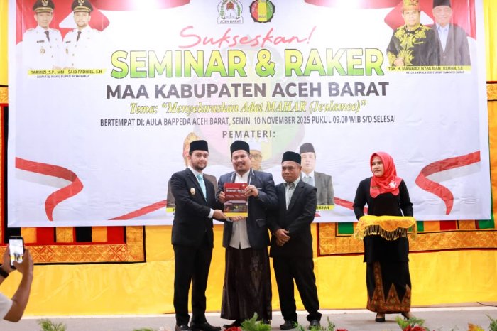 MEULABOH – Penanews.co.id – Majelis Adat Aceh (MAA) Kabupaten Aceh Barat menggelar Seminar Menyelaraskan Adat Mahar (Jeulame) dengan Syariat Islam sekaligus Rapat Kerja MAA Tahun 2025 di Aula T. Umar Bappeda, Senin (10/11/2025).