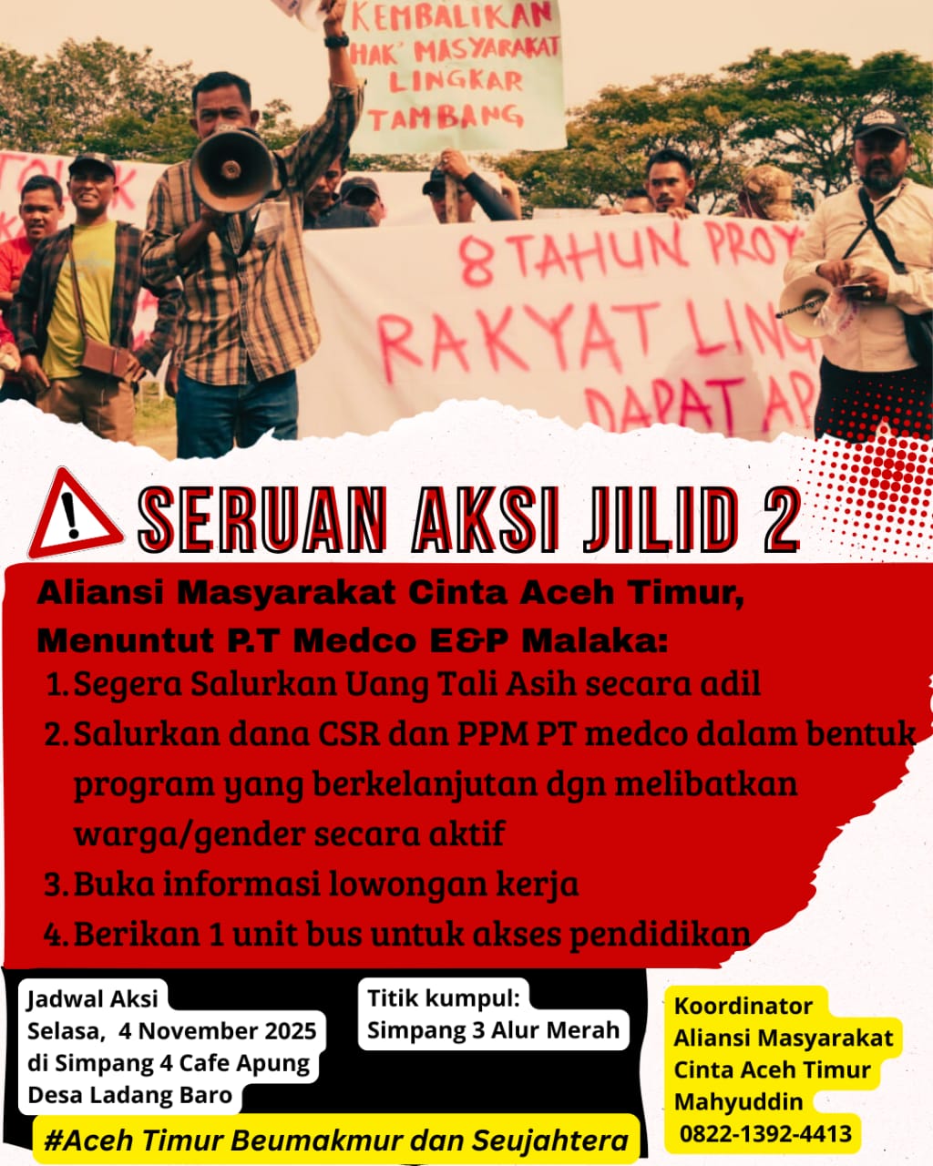 Keengganan tim relation perusahaan berkomunikasi terkait hal tersebut dengan warga, menyebabkan ratusan warga dari desa ring satu, menyatukan diri dalam Aliansi Masyarakat Cinta Aceh Timur yang akan melakukan aksi damai menyuarakan suara warga lingkar tambang pada tanggal 4 November 2025 di Simpang Cafe Apung ROW PT. Medco.