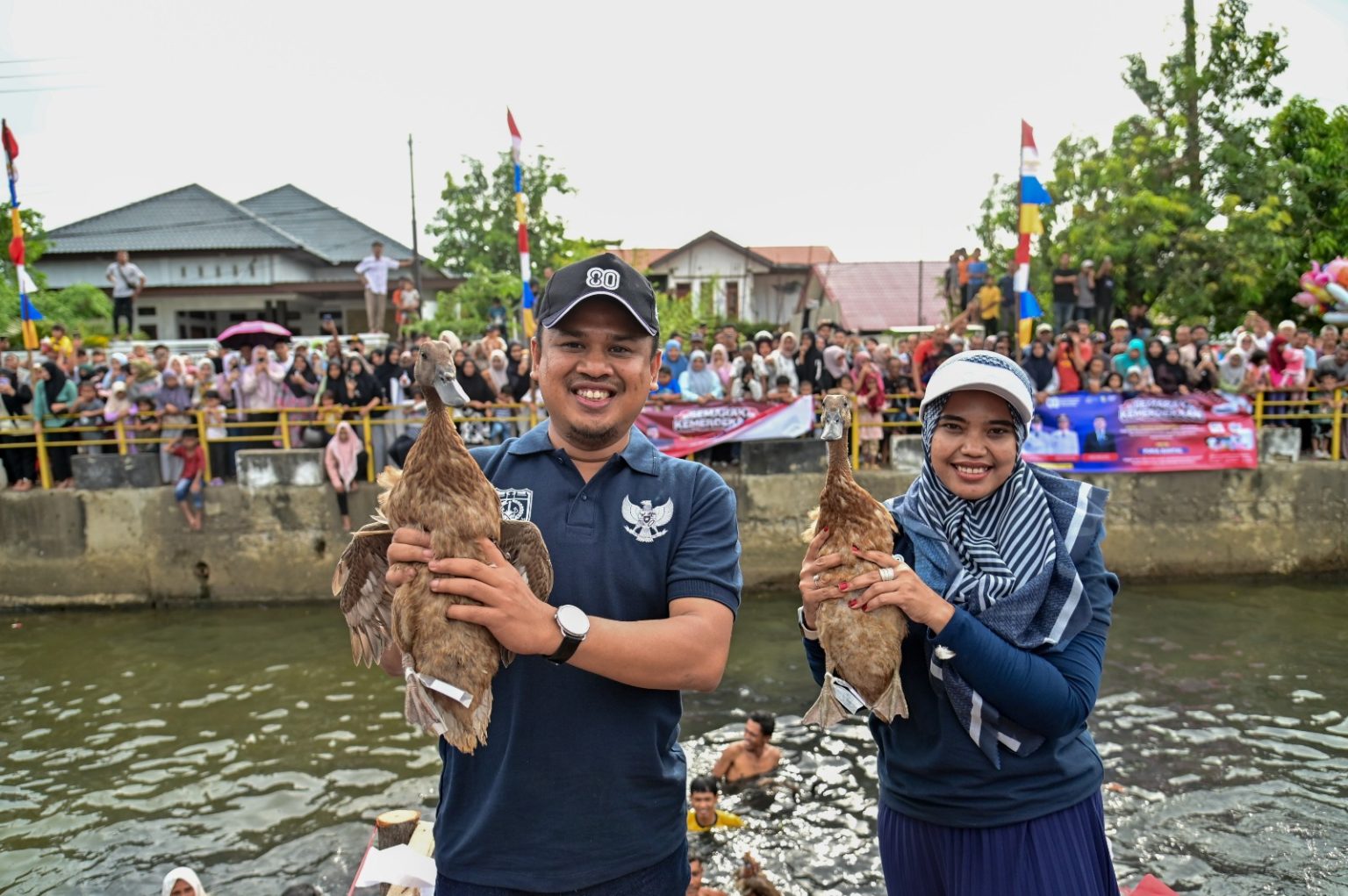 Daniel dan sejumlah tamu undangan ikut melepaskan bebek ke dalam sungai, yang langsung diburu oleh peserta.