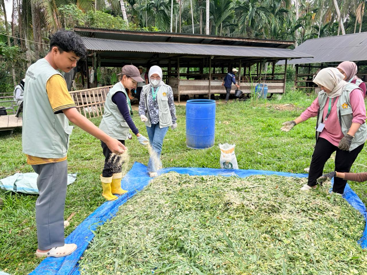 Selain penyerahan alat, tim pengabdian juga menyediakan bibit rumput pakan ternak yang ditanam mahasiswa di lahan kelompok ternak masyarakat sebagai bahan baku fermentasi pakan. Dari sektor pertanian, mahasiswa melakukan demonstrasi pembuatan sistem irigasi tetes untuk tanaman pala wilaja sebagai upaya menjaga ketahanan pangan.