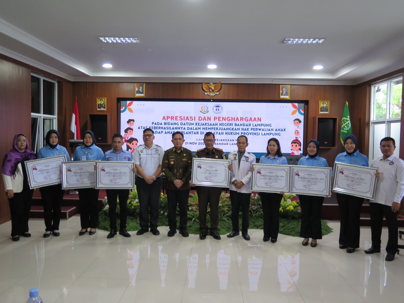 BANDAR LAMPUNG — Kejaksaan Negeri (Kejari) Bandar Lampung menerima penghargaan dari Komnas perlindungan anak (PA) Provinsi Lampung atas keberhasilannya memperjuangkan hak perwalian anak terhadap anak terlantar di wilayah hukum Provinsi Lampung, yang berlangsung di Aula Kantor Kejaksaan Negeri Bandar Lampung pada Kamis (21/11/2024) pagi.