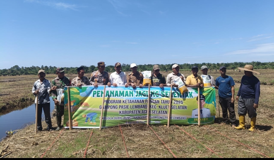 KLUET SELATAN – Penanews.co.id — Di tengah hamparan lahan hijau seluas 20 hektar, Selasa (23/09/2025) warga Gampong Pasie Lembang, Kecamatan Kluet Selatan, bersama perangkat desa dan unsur Muspika menanam jagung secara serentak. Suasana gotong royong terasa, seakan menyatukan semangat kolektif untuk membangun kemandirian pangan di gampong pesisir itu.