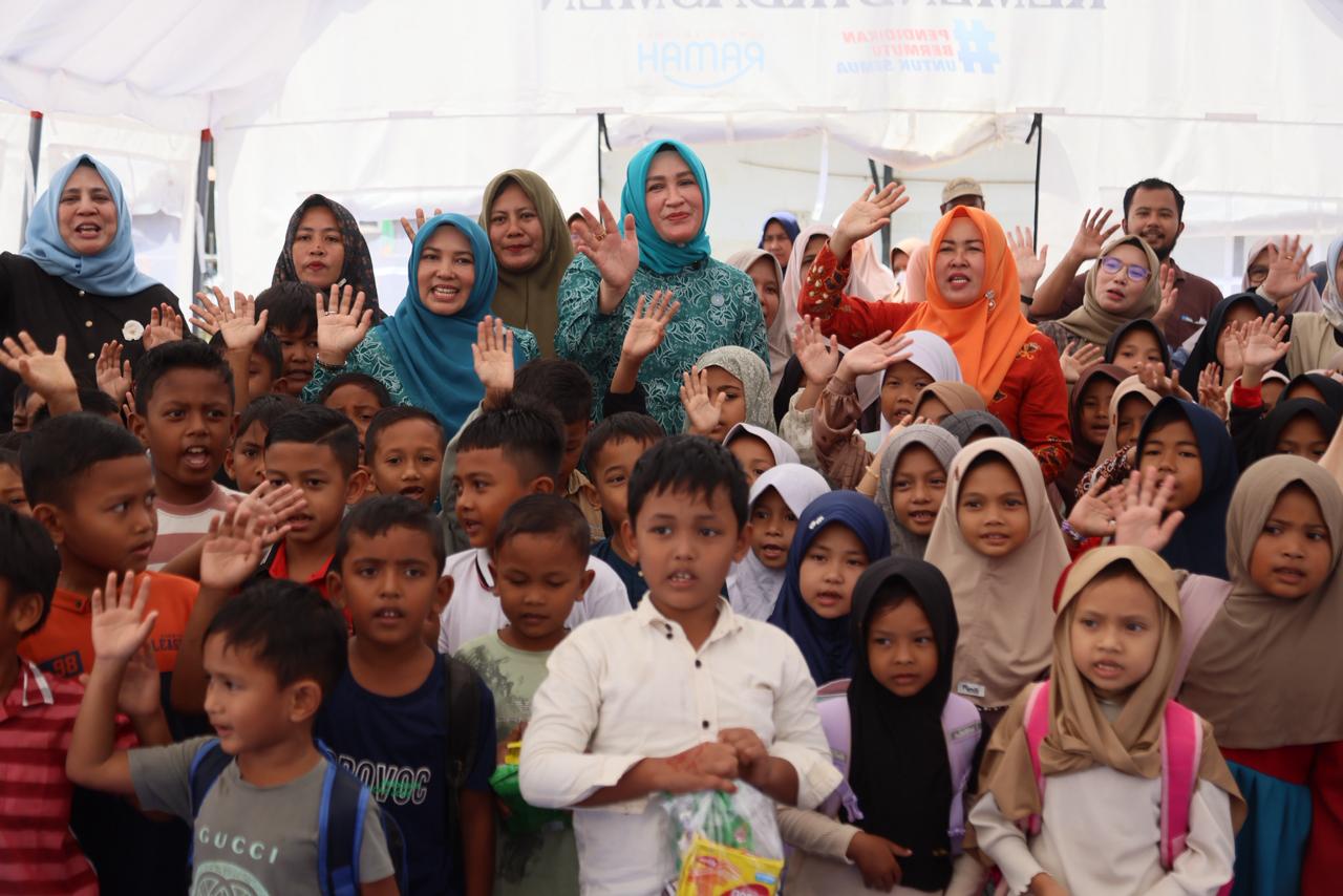 Kepada para siswa, Kak Na yang turut didampingi oleh Ketua TP PKK Aceh Utara Musliana Ismail A Jalil, juga membagikan sekotak susu dan biskuit kepada para siswa.