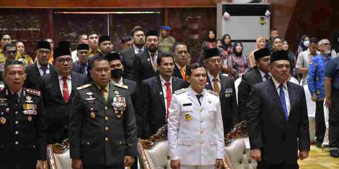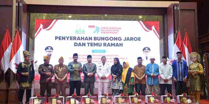 BANDA ACEH – Penanews.co.id – Wakil Gubernur Aceh, H. Fadhlullah SE, bersama pimpinan Forkopimda Aceh menyerahkan Bungong Jaroe serta melakukan temu ramah dengan keluarga Pahlawan Nasional, Pejuang Perintis Kemerdekaan Republik Indonesia, Pembela Kemerdekaan RI, dan Pahlawan Perdamaian Bosnia di Anjong Mon Mata, Pendopo Gubernur Aceh, Senin (10/11/2025).