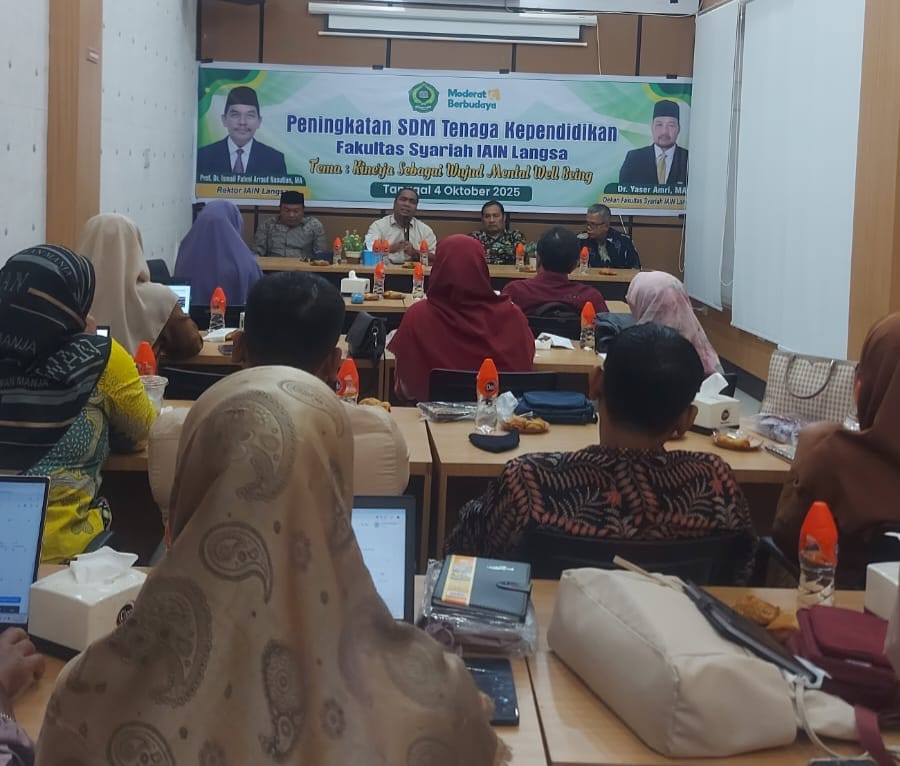 LANGSA — Penanews.co.id — Wakil Rektor I IAIN Langsa, Dr. Amiruddin Yahya Azzawiy, MA mengingatkan pentingnya menjaga mental yang sehat dan sikap positif dalam bekerja, terutama di lingkungan akademik. Hal ini disampaikannya dalam kegiatan peningkatan Sumber Daya Manusia (SDM) tenaga kependidikan dan pimpinan Fakultas Syariah IAIN Langsa, yang mengangkat tema “Kinerja sebagai Wujud Mental Well – Being”, Sabtu, 4 Oktober 2025