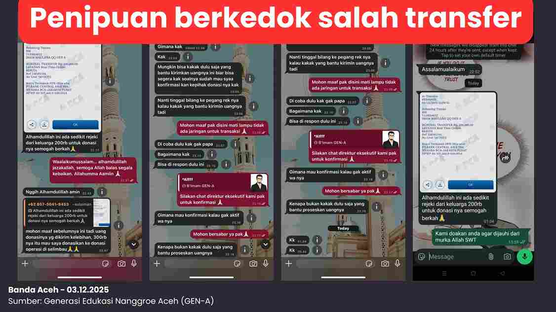 Generasi Edukasi Nanggroe Aceh (GEN-A) hari ini mengeluarkan imbauan resmi setelah menemukan adanya modus penipuan “salah transfer” yang mengarah pada upaya pemerasan. Modus ini terungkap ketika seorang individu menghubungi tim GEN-A dan mengaku telah mengirimkan donasi sebesar Rp500.000, disertai bukti transfer yang belakangan diketahui palsu dan mencurigakan.